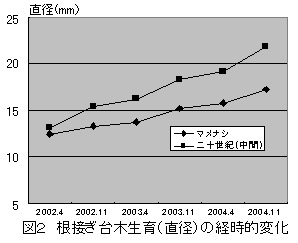 台木の生育量(直径)は「二十世紀」中間台が「マンシュウマメナシ」台より優れる(図2)。