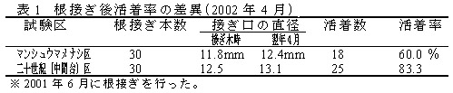 根接ぎ10ケ月後の活着率(接ぎ木部が癒合し、枯死してない状態)は、「マンシュウマメナシ」台より「二十世紀」を中間台にして接いだ方が高い(表1)。