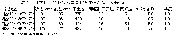 表1 「太秋」における葉果比と果実品質との関係