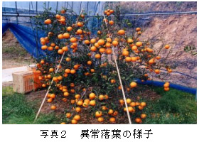 カラタチ台「垂水1号」において春葉の先端部に褐色斑点を生じ、異常落葉する障害が問題になっている。そこで、その発生の実態と対策について検討する。
