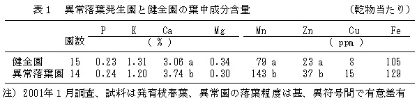 異常落葉発生園の葉中のマンガン含量は健全園に比べて高い。(表1)