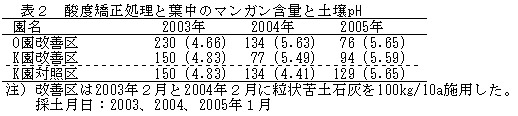 表2 酸度矯正処理と葉中のマンガン含量と土壌pH