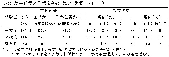 表2 着果位置と作業姿勢に及ぼす影響(2003年)