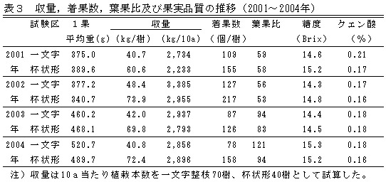 表3 収量,着果数,葉果比及び果実品質の推移(2001〜2004年)