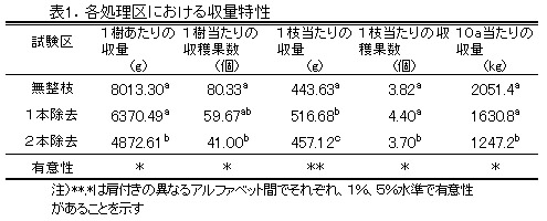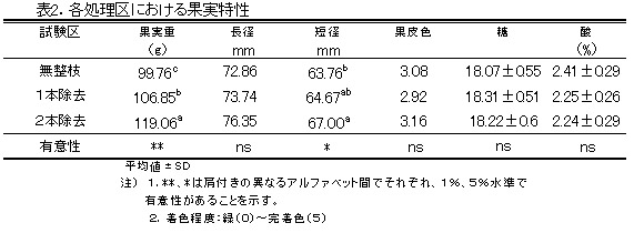 果実重と短径は、2本除去区、1本除去区、無整枝区の順で大きく、果皮色、糖、酸については、処理間による差がない(表2)。