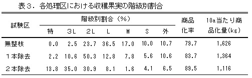 果実の階級別割合は、出荷規格のM玉(90g)以上の果実を対象にした10a当たりの予想商品化量は無整枝区が多い(表3)。