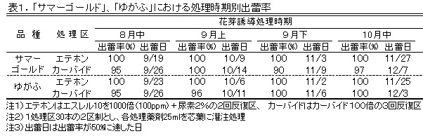 「サマーゴールド」、「ゆがふ」はエテホン2回反復処理で、いずれの処理時期においても出蕾率は100%である。出蕾日もカーバイド3回反復処理と比較して5日〜10日早く、花芽誘導効果が高い(表1)。