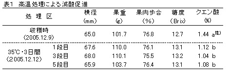 収穫時の酸高なカンキツ類果実の減酸処理方法として、高温処理(摂氏35度)による減酸促進効果が認められている。そこで温州ミカン「大津四号」において、大量の果実の減酸を短期間に促進し、商品化率を高めるためのコンテナ段積みでの高温処理技術を開発する。