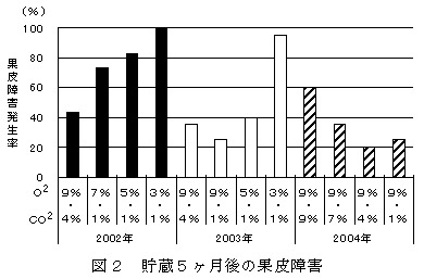 果皮障害は、炭酸ガス濃度が同一条件なら、酸素濃度が高いほど発生は軽減され、逆に、酸素濃度が同一条件なら、炭酸ガス濃度が低いほど発生は軽減される(図2)。