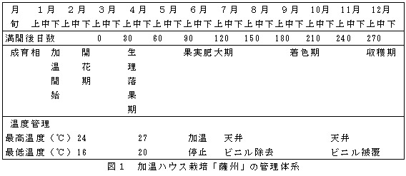 - ハウス栽培「薩州」は、1月下旬から最低温度摂氏16度で加温開始し、4月下旬から最低温度摂氏20度で管理すると、11月下旬〜12月上旬に収穫できる。
