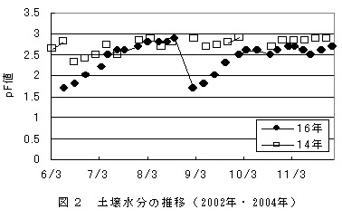 土壌水分管理は、加温開始から開花前までをpF2.0、開花期から8月までをpF2.4、9月から収穫期までをpF2.9とする。収穫期の果実品質は糖度13度、クエン酸0.9%となる(表4、図2)。