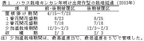 研究課題名:施設キンカンの年明け完熟出荷体系の確立 予算区分 :県単 研究期間 :2001〜2003年度