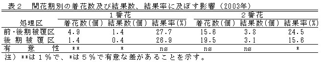 表2 開花期別の着花数及び結果数、結果率に及ぼす影響(2003年)
