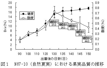 以上の結果から、N67-10自然夏実の適熟期の打音値は46-65(m/s)であり、この値を基準に適熟果の選別の可能性がある。