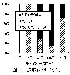 食味試験で美味しいと答えた割合は、出蕾後135日以降で多く、とても美味しいの割合は140日および145日で多くなる(図2)。