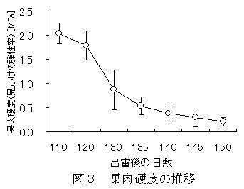 果肉硬度の値は、出蕾後130日から急激に低下する(図3)。