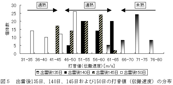 打音値は、出蕾後135日では61-80(m/s)、140日では46-65(m/s)、145日では41-65(m/s)および150日では31-50(m/s)の範囲に分布する(図5)。