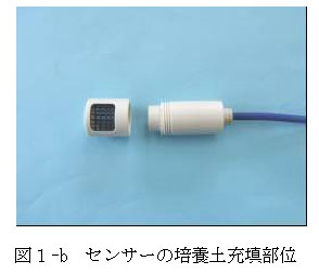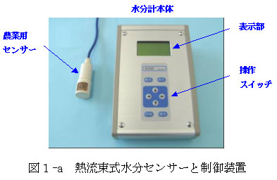 - 熱流束式水分センサーは、センサー内部に測定土壌を充填し畝に埋設する。センサーはヒーター加熱による温度上昇速度から含水率を算出し、含水率0〜99%の範囲で測定できる(図1-a、図1-b)。