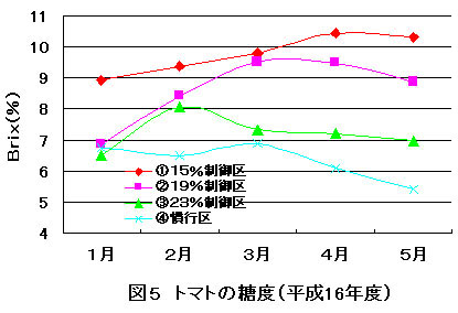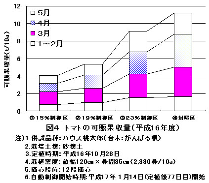 熱流束式水分センサー利用による土耕トマト栽培のかん水自動制御において、水分設定値を低くするほどトマト平均1果重が軽くなり可販果収量は減少するが、糖度は高くなり、慣行栽培の糖度が低下する4月以降においても、安定して高く推移する(図4、図5)。