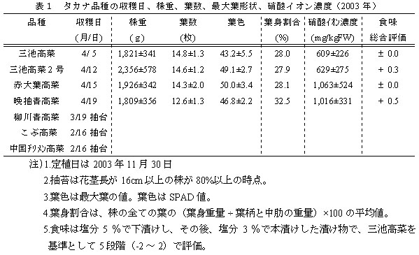 表1 タカナ品種の収穫日、株重、葉数、最大葉形状、硝酸イオン濃度(2003年)