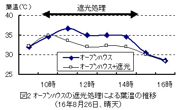 図2 オープンハウスの遮光処理による葉温の推移(16年8月26日、晴天)