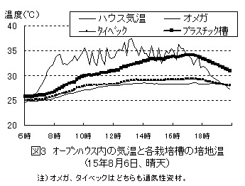 図3 オープンハウス内の気温と各栽培槽の培地温(15年8月6日、晴天)