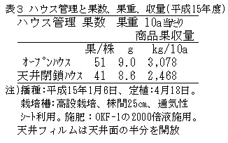 表3 ハウス管理と果数、果重、収量(平成15年度)