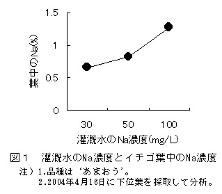イチゴ高設栽培では、灌漑水のNa濃度が高くなると葉中のNa濃度が上昇する(図1)。