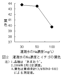 Na濃度が100mg/Lの灌漑水を利用すると、厳寒期の1月中旬頃より新葉の黄化がみられ、Na濃度0mg/Lの灌漑水と比べて`とよのか'、`あまおう'、`さちのか'の3品種ともに3〜5月の収量が低下する(図3、図5)。