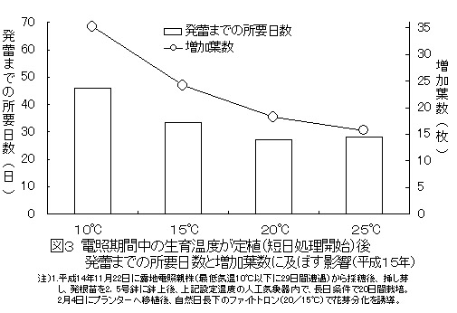 図3 電照期間中の生育温度が定植(短日処理開始)後の発蕾までの所要日数と増加葉数に及ぼす影響(平成15年)