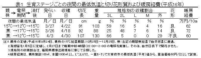表1 生育ステージごとの夜間の最低気温と切り花形質および暖房経費(平成16年)