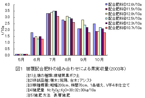 図1 被覆配合肥料の組み合わせによる果実収量(2003年)