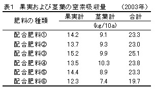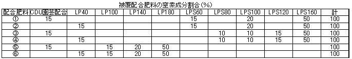 作物体の窒素吸収量の多い被覆尿素の最適配合比率は、シグモイド型被覆尿素80日タイプ(10%)、100日タイプ(10%)、120日タイプ(15%)、160日タイプ(50%)である(表1)。