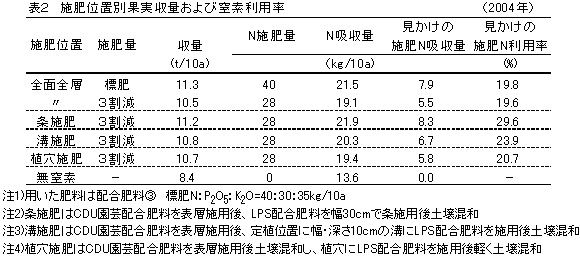 条施肥を行うと、3割減肥でも標準施肥量の表層施肥と同等の収量が得られる(表2)。