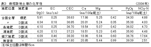 栽培跡地土壌の化学性については、全ての施肥方法で適正な範囲内に保たれるが、硝酸態窒素の残存量は、植穴施肥では多くなる(表3)。