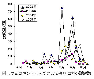 タバコガは4月下旬〜5月上旬から成虫の発生がみられ、8月〜10月に多発する(図1)。
