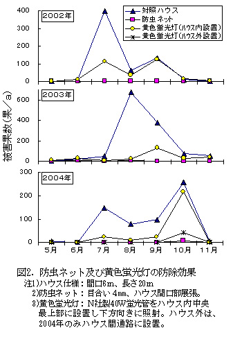 図2 防虫ネット及び黄色蛍光灯の防除効果