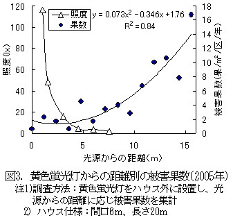 図3 黄色蛍光灯からの距離別の被害果数(2005年)