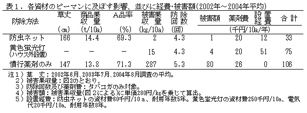 表1 各資材のピーマンに及ぼす影響、並びに経費・被害額(2002年〜2004年平均)
