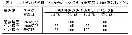 表1 小ネギ堆肥を用いた場合のコマツナの発芽率(2004年7月)(%)
