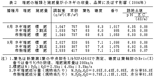 表2 堆肥の種類と施肥量が小ネギの収量、品質に及ぼす影響(2004年)