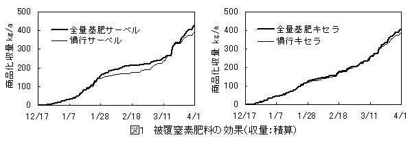 70%緩効率の被覆尿素入り配合肥料を全量基肥施用すると(表1)、「サーベル」では慣行施肥以上の「キセラ」では同等の収量が得られ(図1)、軽労化が促進される。