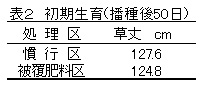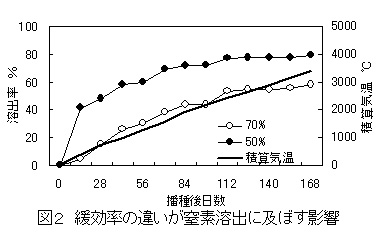 被覆肥料は慣行施肥に比して初期生育が若干劣るが(表2)、これは緩効率70%の場合、生育初期が低温期に当たり窒素溶出が抑制されるためと考えられるので(図2)、初期生育の促進とコストの面から緩効率は50%が適する。