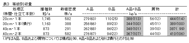 栽植密度が高いほど増収するが、播種量(株穴×3粒)とマルチ穴開けの手間を考慮すると、株間40cm・3粒播き2本仕立てが適する(表3)。