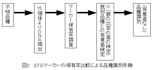 品種識別のためには、15個体で各マーカーの保有率を調査し、マーカー毎に既知の品種と「2群の比率の差の検定」を行う。この結果、いずれマーカーでも有意差が認められない場合は、同一品種の可能性が高い(図2)。