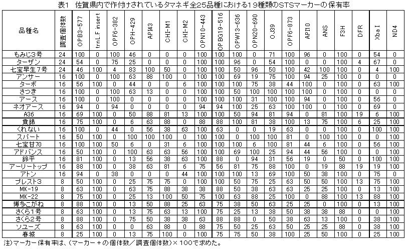 表1 佐賀県内で作付けされているタマネギ全25品種における19種類のSTSマーカーの保有率