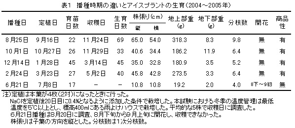 表1 播種時期の違いとアイスプラントの生育(2004〜2005年)