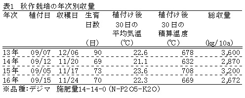 - 2002〜2004年の中央干拓気象値から植付け後30日間の日平均気温が約摂氏23度になるのは、9/4〜9/13である。また、植付け後30日間の積算温度が摂氏約700度になるのは、9/3〜9/11である。双方を満たす9/4〜9/11の間が平均的な植付時期となる。
