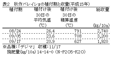- 諫早湾中央干拓地における秋作バレイショの植付時期は、植付後30日間の日平均気温が摂氏23度程度で、30日間の積算温度摂氏700度前後となる9月4日から11日の間が適当である。