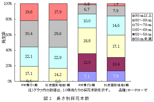 粉砕杉皮固形培地区は、ロックウール慣行区に比べ70cm以上の上位等級切り花発生率が高い(図2)。